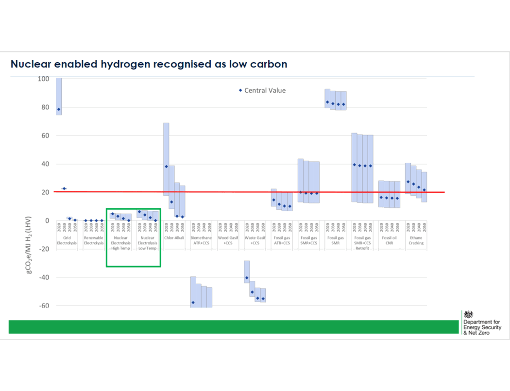 - Hydrogen will play a major role in decarbonisation where electrification is challenging. The UK government has set a vision of hydrogen production from renewables, nuclear and other energy sources. Notably, nuclear-enabled hydrogen is recognised as a low carbon source of energy.
